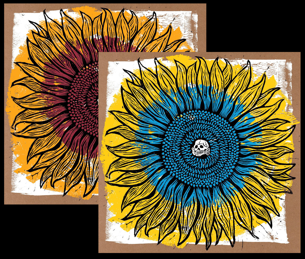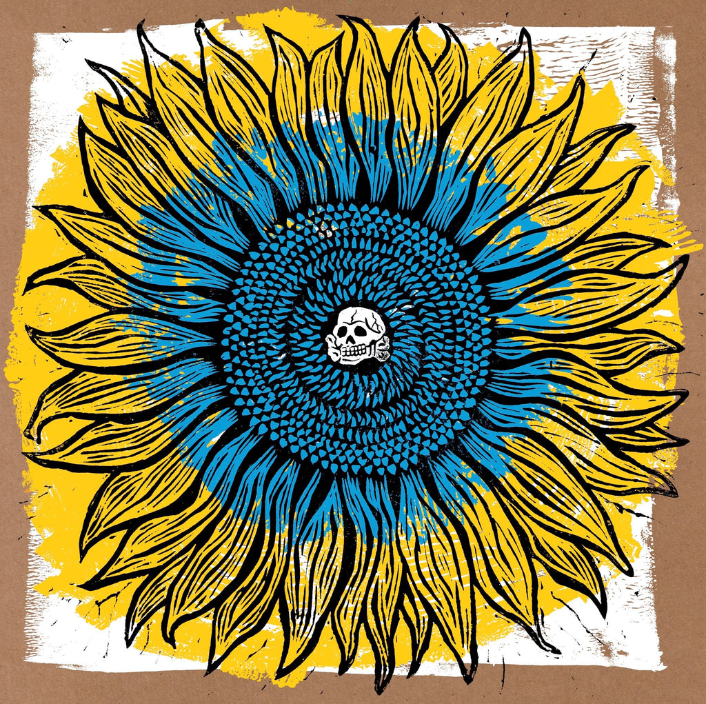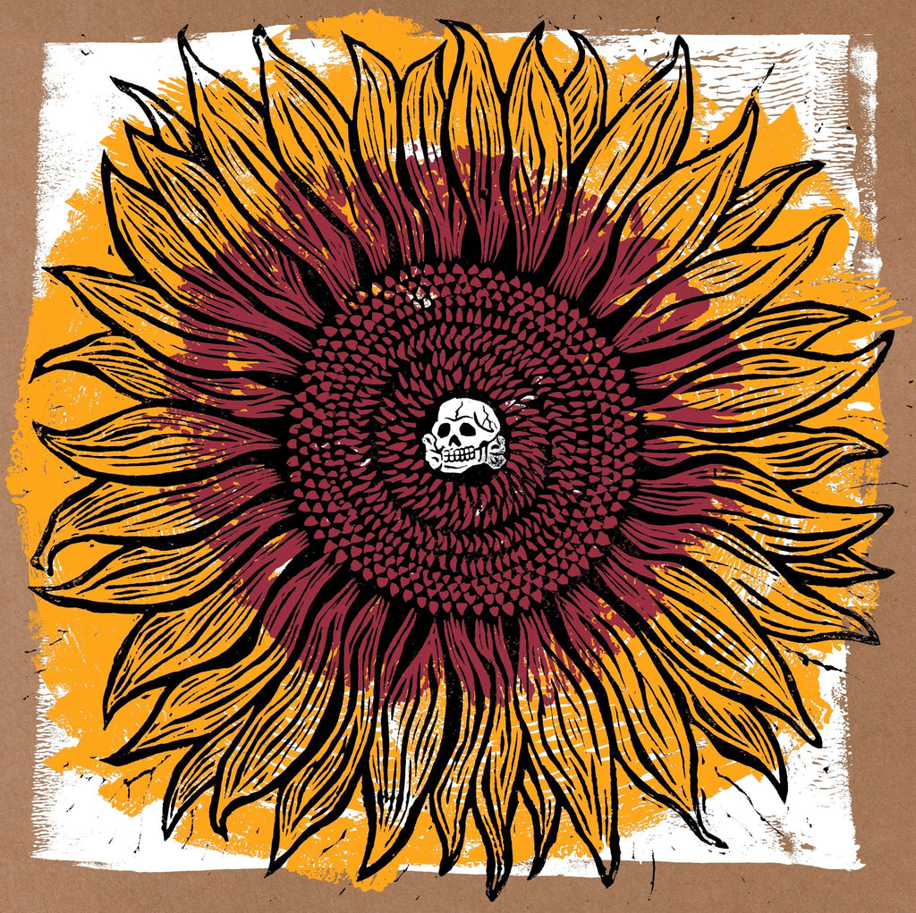 Most of the gatefold sleeve has artwork by HAZE XXL & silkscreened in 4 colors on our regular tan chipstock sleeves by Obsolete Industries. It was then was further customized with the inner part of the gate getting hand-stamped using a giant stamper with ink that ranges from pale ivory to creamy yellow & adorned with little holographic flower stickers in various colorways. Edition # is hand-stamped on the inside of the gate under the large skull stamp. After the set was assembled & sealed in the plastic sleeve, a final detail of another small sticker was put on to line up with the center of the sunflower on the front of the sleeve. Even beyond the variation you get with hand-stamping so much, there's so much more going once once to factor in the different shades of color between the in letterpress & stamper inks & the holographic stickers, truly none of the sleeves will be exactly like any of the others.